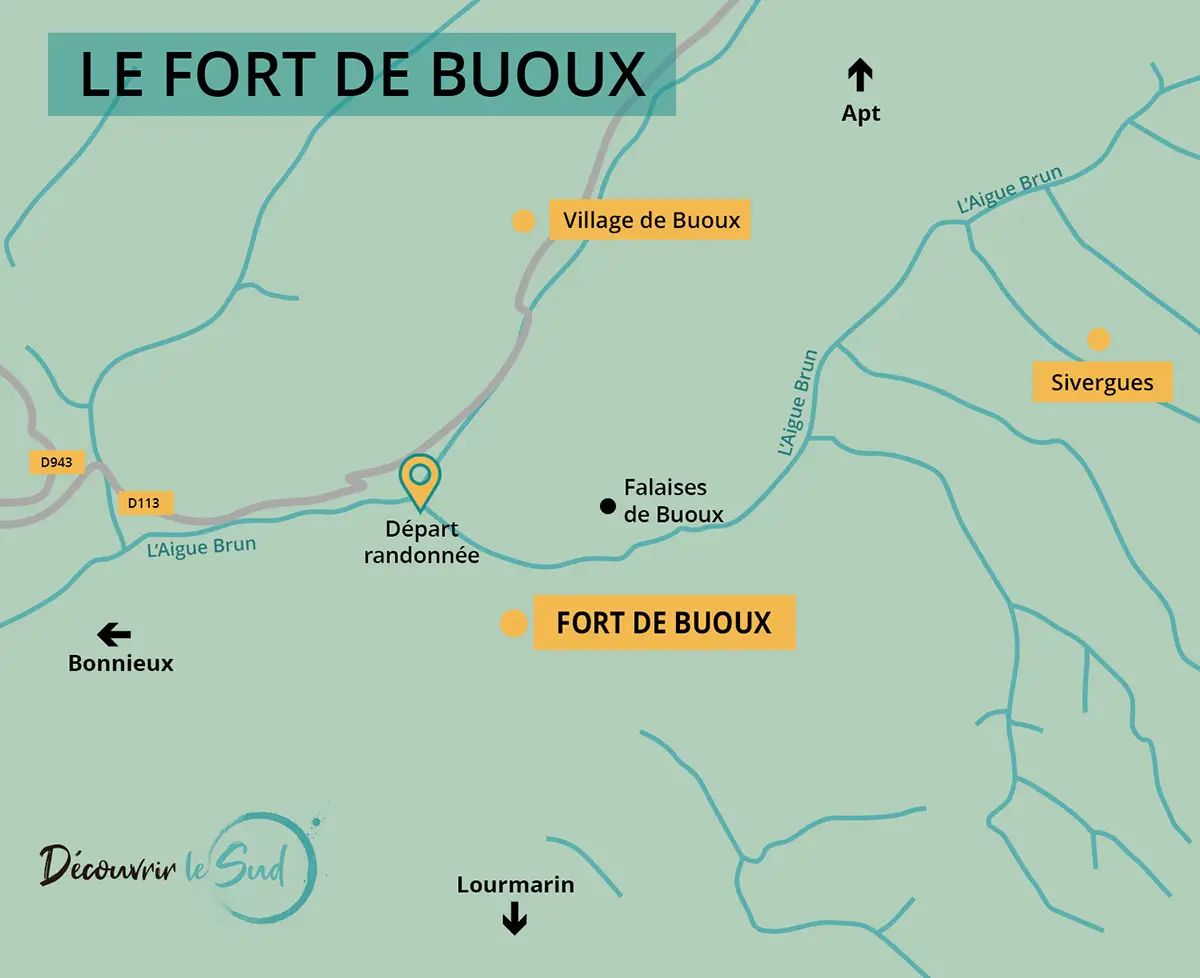 ◉ Où se situe le Fort de Buoux ? À environ 1km au sud du village de Buoux, dans le vallon de l’Aiguebrun